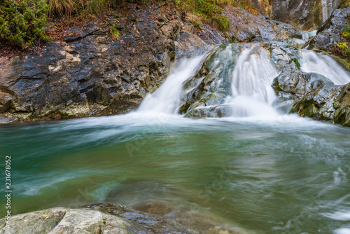 © Nicola Simeoni, Fototapeta premium Waterfall and autumn colors. Magic of the Julian pre-Alps.