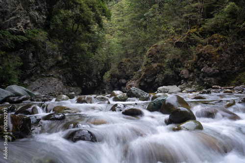 © Daniel Thomas, Obraz premium Waterfall and river in a forest in New Zealand