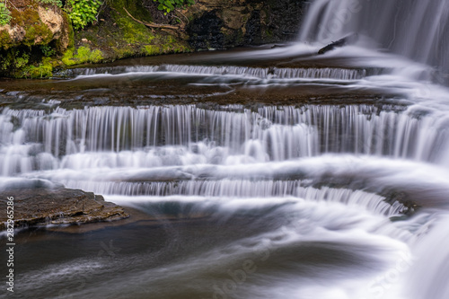 © DanielCarson, Obraz premium waterfall at belfountain conservation area Ontario Canada with trees, rocks, bridge, and long exposure