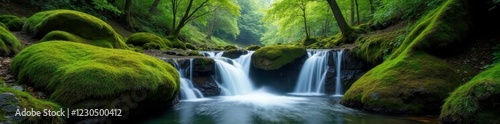 © box, Obraz premium Waterfall at Golitha Falls with moss covered rocks, forest, cornwall