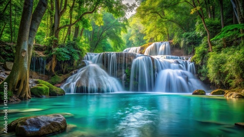 © Praphan, Obraz premium Waterfall cascade in dense forest, crystal clear water