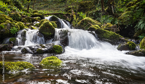 © Kufotos, Fototapeta premium Waterfall cascade in tropical forest with stones and moss on summer sunny day. Beautiful landscape of a mountain river in Adjara, Georgia
