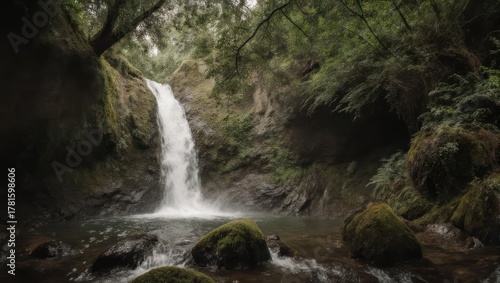 Naklejka premium Waterfall cascades into a mossy pool surrounded by lush green foliage and...
