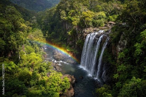 © Sarqiah, Obraz premium Waterfall cascades into river, rainbow appears, forest backdrop, travel, brochure use