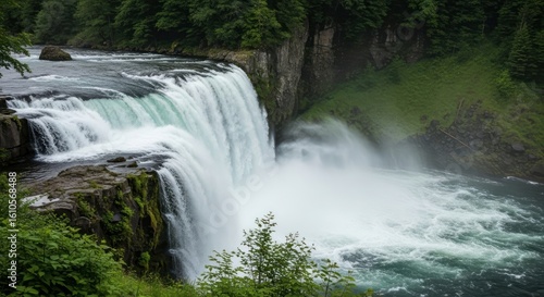 © novan, Fototapeta premium Waterfall cascades into river surrounded by lush green forest