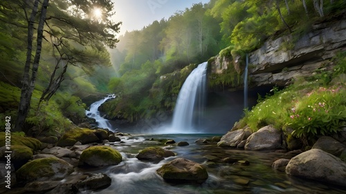 © Dushan, Fototapeta premium Waterfall cascading down a rugged cliff surrounded by lush greenery, cartoon, art