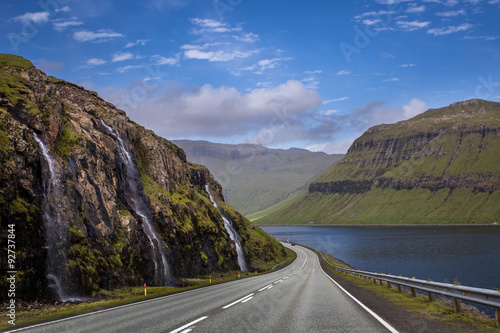 © EyesTravelling, Fototapeta premium Waterfall Cascading Down Green Slope in Faroe Islands