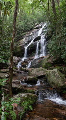 Naklejka premium Waterfall cascading down moss-covered rocks through lush, green forest...