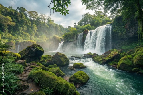 © MDNAZRUL, Fototapeta premium Waterfall Cascading Down Mossy Rocks Tropical Jungle