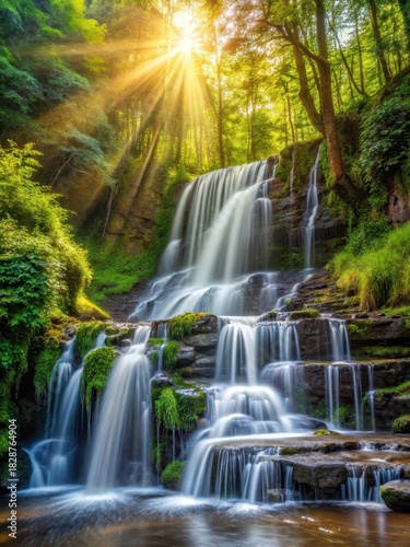 © PIMCHANOK, Obraz premium waterfall cascading in deep forest glistening sunlight