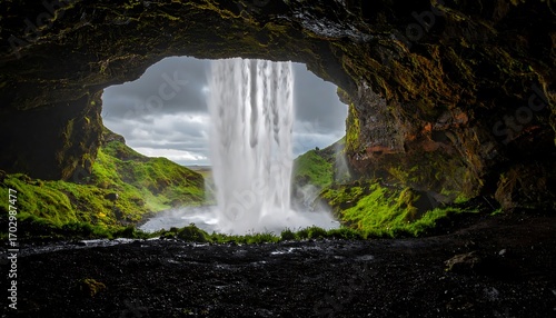 © suka, Fototapeta premium Waterfall cascading into a cave, lush green landscape