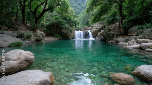 Naklejka premium Waterfall Cascading Into Emerald Pool Surrounded By Lush Tropical Foliage and Trees in Verdant Forest with Rocks and Clear Water in Daylight