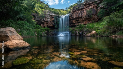 © Zeva, Obraz premium Waterfall cascading into tranquil pool, lush greenery, sunny sky, nature backdrop; travel, tourism
