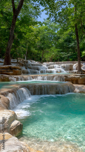 © Nattavee, Naklejka premium waterfall cascading into turquoise pool surrounded by lush green tropical forest