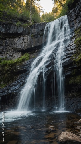 © Nemanja, Obraz premium Waterfall cascading over rocky cliff surrounded by lush greenery