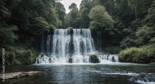 Fototapeta premium Waterfall cascading over rocky ledges surrounded by dense forest vegetation with smooth flowing river in foreground and soft lighting, Copy Space