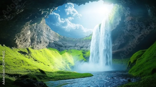 © Zeva, Fototapeta premium Waterfall cave Iceland nature scenic background travel