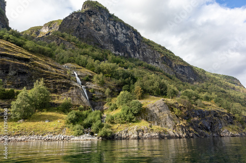 Fototapeta premium Waterfall falling in norwegian fjord Aurlandsfjord