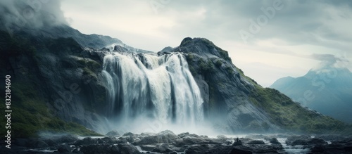 Fototapeta premium Waterfall flowing from a mountain with a cloudy sky as background. Creative...