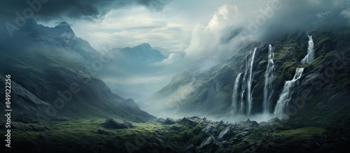 © HN Works, Fototapeta premium Waterfall flowing from a mountain with a cloudy sky as background. Creative banner. Copyspace image