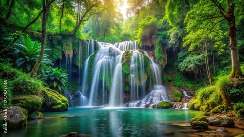 © Nasnunt, Obraz premium waterfall in dense forest, outdoor landscape, natural wonders