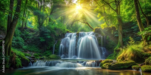 Fototapeta premium waterfall in dense forest with sunlight filtering through leaves, tranquil...