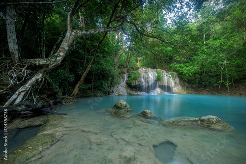 © yotrakbutda, Naklejka premium Waterfall in forest at Erawan waterfall National Park, Kanchanaburi, Thailand