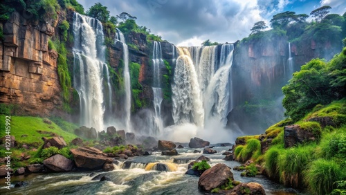 © Praphunsak, Naklejka premium Waterfall in misty surroundings with lush greenery and large rocks at Kalandula Falls, Angola , rocks, tropical