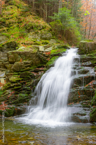 Fototapeta premium Waterfall in Obidza, late autumn, Beskid Sadecki mountain range in Carpathian Mountains, Poland.
