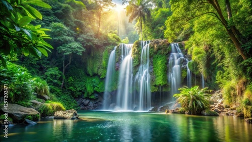 Fototapeta premium waterfall in serene jungle with water flowing gracefully, outdoor scene,...