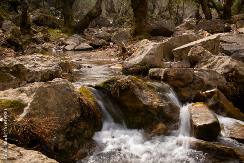 © Natalia, Fototapeta premium Waterfall in the forest surrounded by trees covered with moss