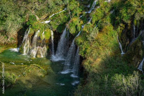 Obraz premium Waterfall in the Plitvice Lakes in Croatia. The waterfalls in forest. Summer view of beautiful waterfalls and clear lake. Plitvice Lakes National Park, Croatia. Summer nature landscape.