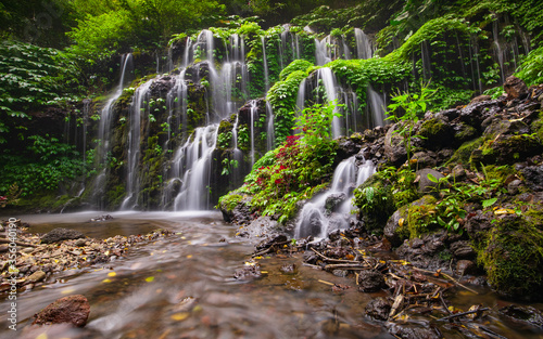 © Olga, Fototapeta premium Waterfall landscape. Beautiful hidden waterfall in tropical rainforest. Nature background. Slow shutter speed, motion photography. Banyu Wana Amertha waterfall, Bali, Indonesia
