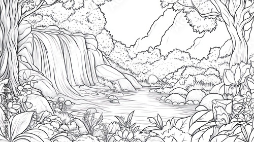 Fototapeta premium Waterfall scene, lush rainforest, tranquil stream, coloring page