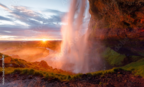 © Feel good studio, Obraz premium Waterfall Seljalandsfoss in Iceland, beautiful sunset golden hour scenery.