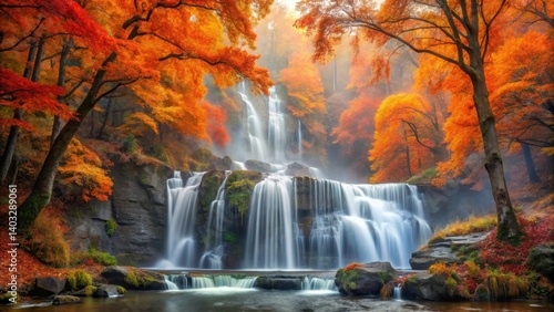 © Songkran, Obraz premium waterfall surrounded by autumn orange trees in a misty atmosphere , scenic, vibrant, scenic, vibrant, wood