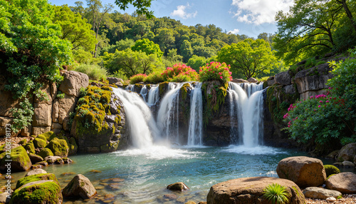 Fototapeta premium Waterfall surrounded by lush green forest in daylight