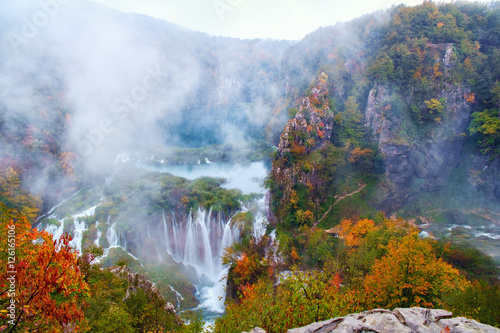 Fototapeta premium Waterfall the Plitvice Lakes in autumn