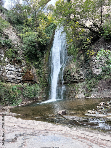© Ekaterina, Fototapeta premium waterfall white bridge over mountain rivers Tbilisi Botanical Garden