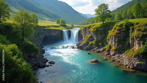 © Antonio, Fototapeta premium waterfall with blue water and green trees on the side