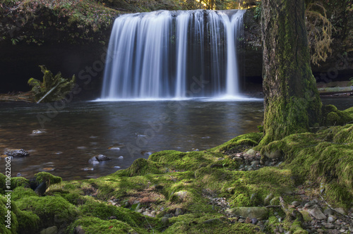 Fototapeta premium Waterfall with mossy tree and rocks in foreground/Waterfall with soft...