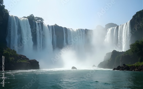 © wang, Fototapeta premium Waterfalls, great Iguasu waterfalls seen from the boat bind the fog and splashes of falling water. High quality