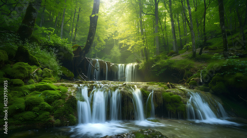 © Ashiq, Obraz premium Waterfalls in forest. Fresh waterfalls in deep forest