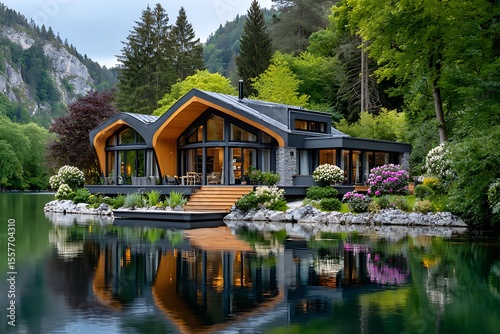 Obraz premium Waterfront house featuring modern angular design high resolution picture