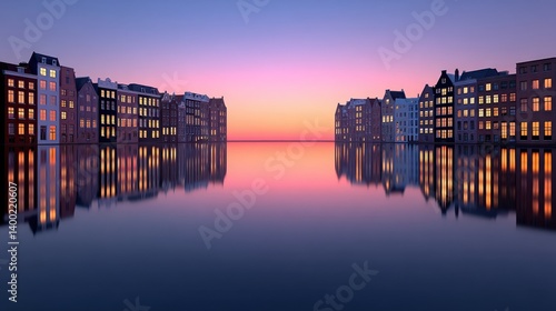 Fototapeta premium Waterfront modern residential buildings in soft gradient light reflected on mirrorlike canal surface showing tranquil architecture symmetry and reflective evening atmosphere