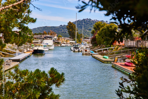 Naklejka premium Waterfront properties with boats docked at end of piers with massive hill...