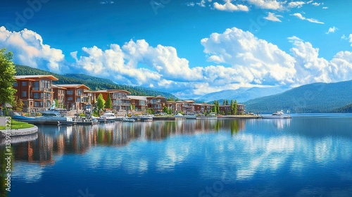 Naklejka premium Waterfront view from Sandpoint, Lake Pend Oreille sparkling blue, condos and resorts nestled by marinas, summer sky reflecting on water