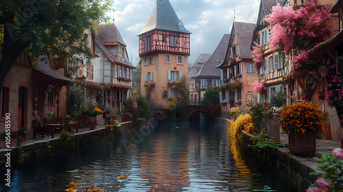© Clocken, Fototapeta premium Waterfront Village with Stone Bridge Illustration