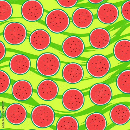 Fototapeta premium Watermelon round pieces. Seamless pattern. Vector illustration on green striped texture