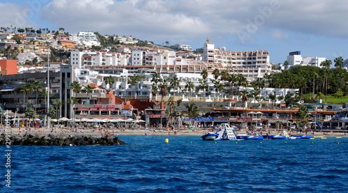 Naklejka premium Waterside distant view Los Cristianos coastline, people enjoy warm Atlantic Ocean pretty beach, touristic town, situated on south coast of Canary Islands, Spain